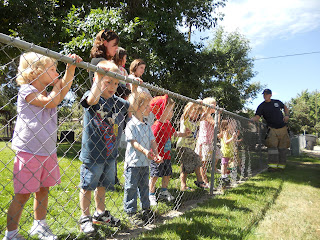 However, the most important part of the visit, in my opinion, was having the children see a firefighter don and remove their protective gear. It is very important for children this age to learn not to be afraid of firefighters, so that in the event of an emergency, the children do not hide from them. To this end, firefighter Dustin willingly put on his full uniform (mask, helmet, gloves, etc) in front of the children so that they could see that beneath the mask was a person.